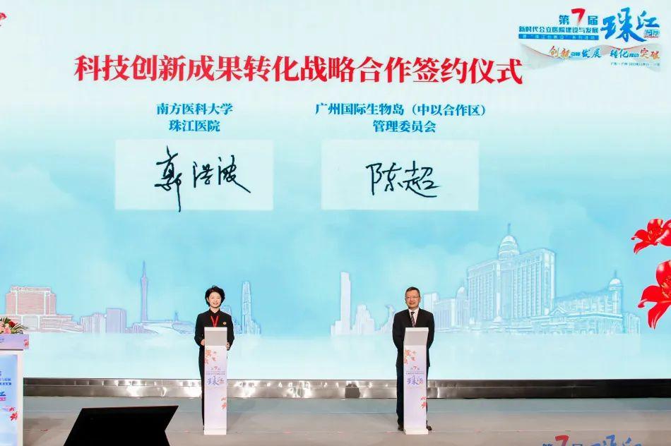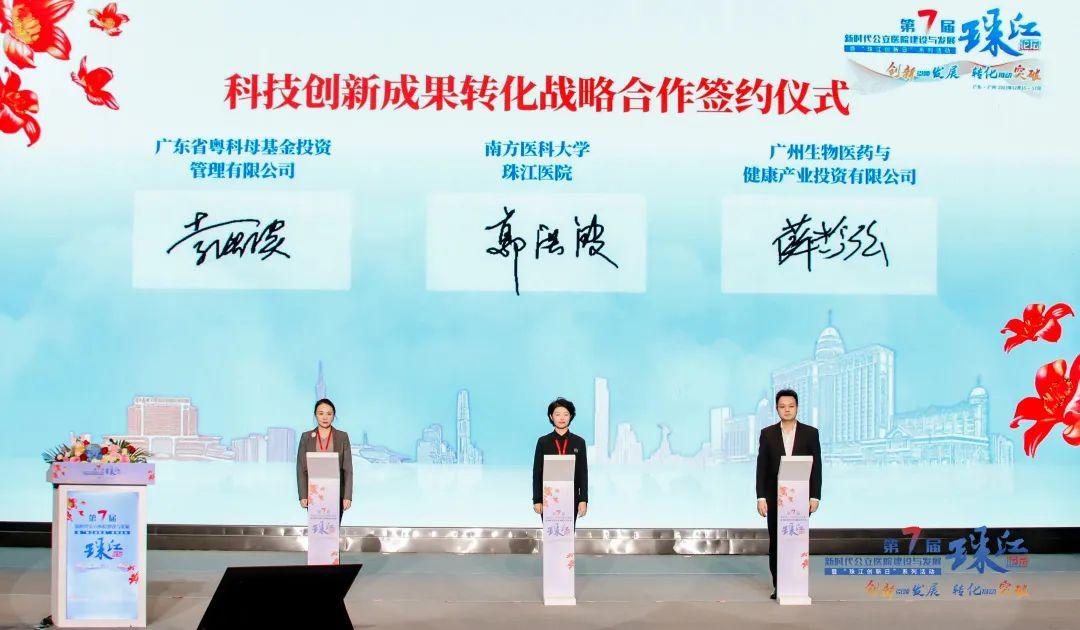 珠江创新成果转化战略合作签约仪式同步举行。珠江医院和广州国际生物岛(中以合作区)管理委员会、广东省粤科母基金投资管理有限公司、广州生物医药与健康产业投资有限公司三家代表“省-市-区”的产业基地“强强联合”,开展科技创新成果转化战略合作,将持续提升医院创新转化能力,进一步推动广东、广州生物医药产业高质量发展。