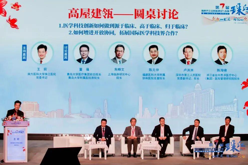 医学科技创新如何做到源于临床、高于临床、归于临床?如何增进开放协同,拓展国际医学科技界合作?在主论坛圆桌讨论环节,来自青岛大学医疗集团前总院长董蒨、福建医科大学附属协和医院名誉院长陈元仲、深圳市第三人民医院院长卢洪洲、浙江省台州恩泽医疗中心(集团)医院管理研究院院长陈海啸、上海临床研究中心院长朱畴文与珠江医院党委书记王前共同展开探讨,分享了各自在实践中积累的观点与经验。
