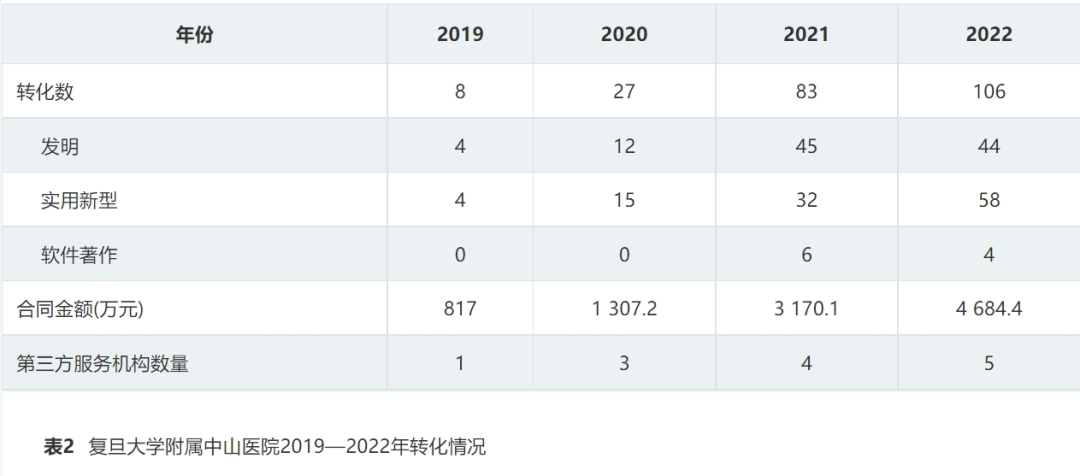复旦大学附属中山医院的专利申请数量由2012年的35件提升为2022年的929件,转化项目数由2019年的8项提升为2022年的106项。其实践证明,引入知识产权代理公司加速专利申请进程;委托第三方服务机构推进创新成果转化;与企业建立战略合作伙伴关系,共同开发和推广医疗科技产品等多方位整合社会力量措施可以促进医学专利的申请和转化,加速医学科技的应用,同时为医院带来更多的资金支持和发展机会。