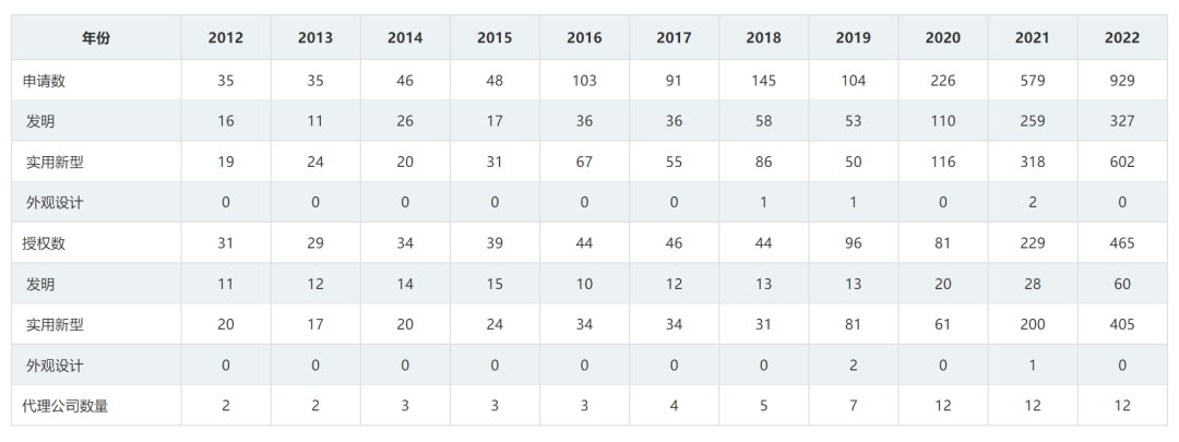 自2012年引入知识产权代理公司协助医院专利申请和管理后,医院专利申请数和授权数稳步增高(表1)。专利申请数量由2012年的35件提升为2022年的929件,专利授权数量由2012年的31件提升为2022年的465件。