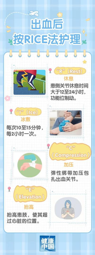 一旦发现血友病患者出血,最重要的是尽快为其注射凝血因子。其后可按RICE 法进行护理。