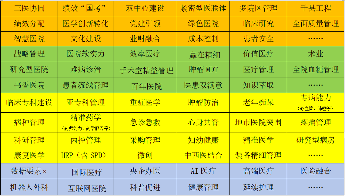 筹备初期,健康界根据政策导向、行业热点、医院管理重点难点,初拟68个备选内容模块供你选择,或者你可受此启发开发别的模块。
